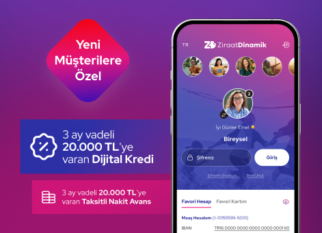 Ziraat Dinamik Mobil'den müşterimiz olun, %1,99 faizli 20.000 TL'ye varan veya %2,99 faizli 100.000 TL'ye varan Dijital Kredi ile %1,99 faizli 20.000 TL'ye varan Taksitli Nakit Avans'tan faydalanın.