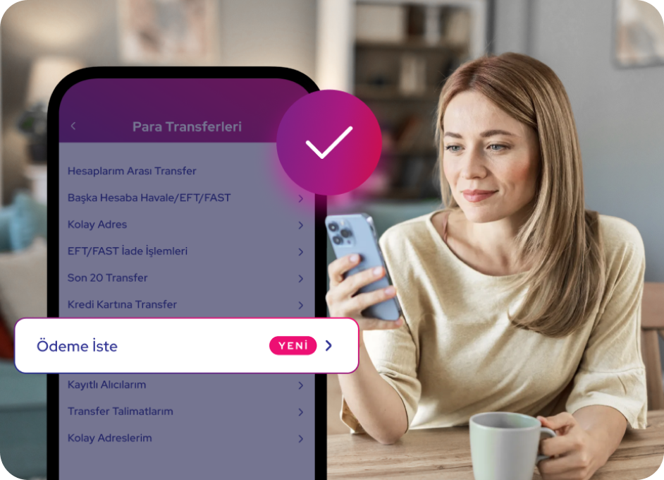 "Ödeme İste" menüsü altından; Yeni ödeme talepleri oluşturabilir, gelen ödeme isteklerini görüntüleyebilir, ödeme isteklerini kabul ederek para transferini gerçekleştirebilir veya talebi reddedebilirsiniz.